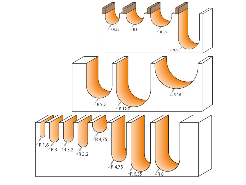Vyrábějte dveře, čela zásuvek, desky nebo jiné povrchy s vlastním motivem. Vypouklé frézy Vám umožní vytvořit rytiny do jakéhokoliv dřeva nebo dřevěného výrobku. Nabízíme kompletní výběr průměrů a řezných hloubek, abyste dosáhli požadovaného výsledku. S použitím našeho frézovacího stolku můžete frézovat až do hloubky 31 mm. Pro složitější dekor nabízíme také frézy s horním ložiskem – použijte vlastní šablonu a některou z těchto fréz pro výrobu opravdu unikátních dveří a čel zásuvek.