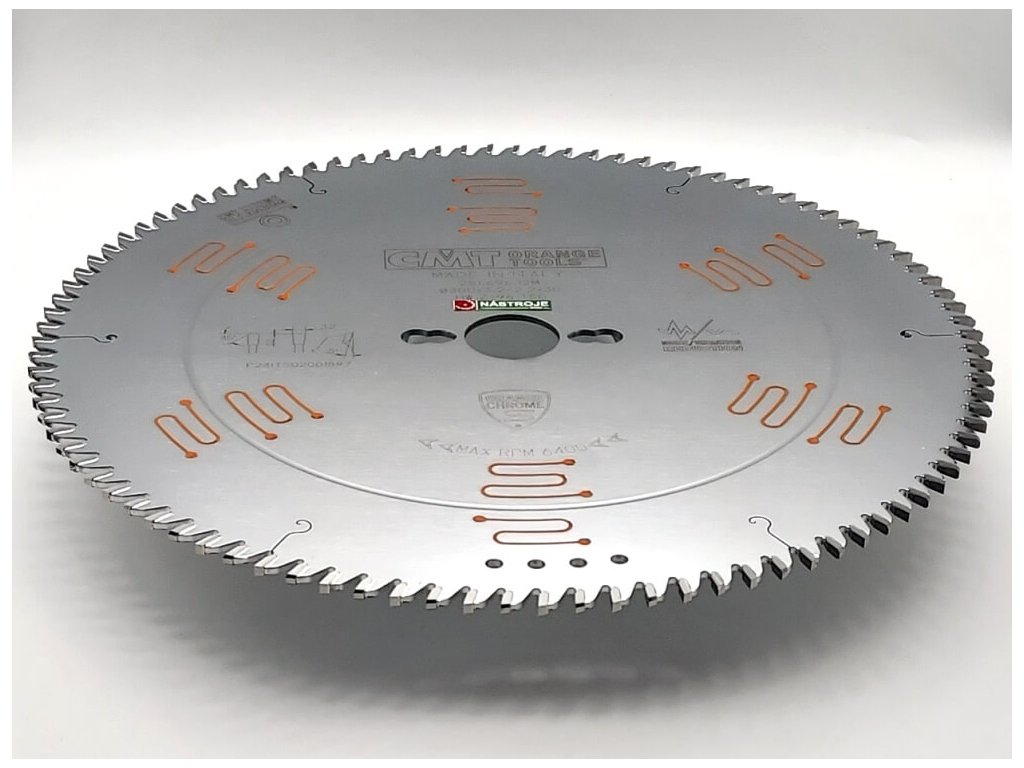 Pilový kotouč na lamino CMT CHROME, DTD, MDF o průměru 300x3,2 d30 Z96 HM. Nový pilový kotouč s chromovaným povrchem, který redukuje ulpívání zbytků lepidla a pryskyřice na těle kotouče. Trapézové zuby jsou vyrobeny z extra tvrdého tvrdokovu pro řezání lamina, dřevotřískových desek a MDF.