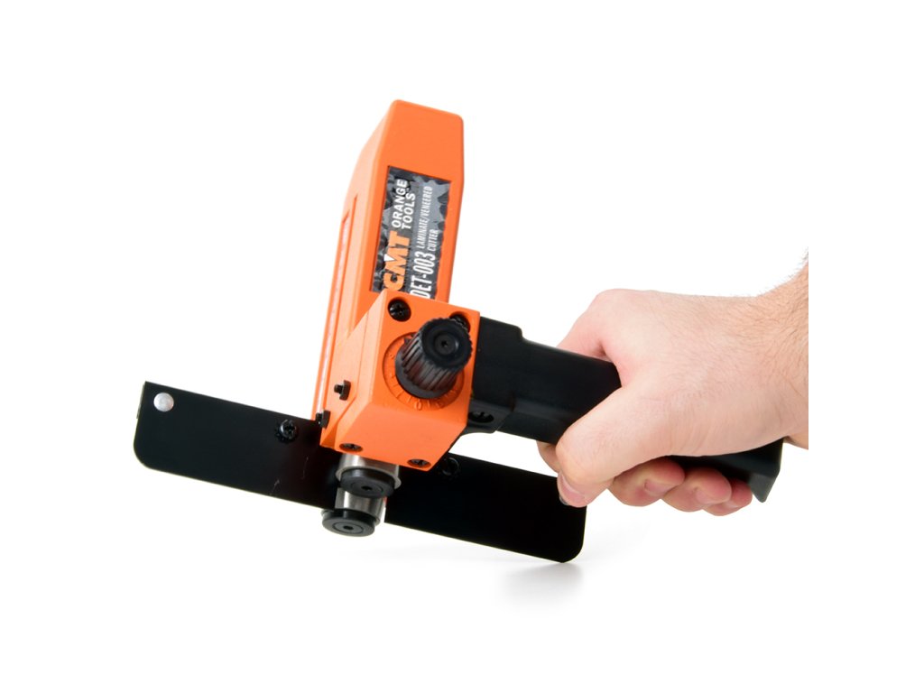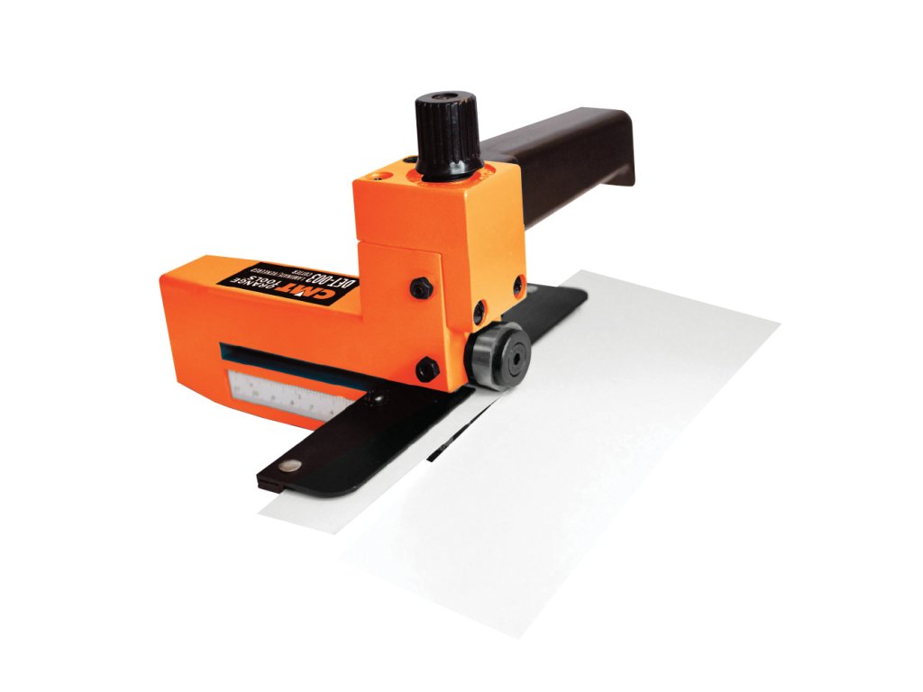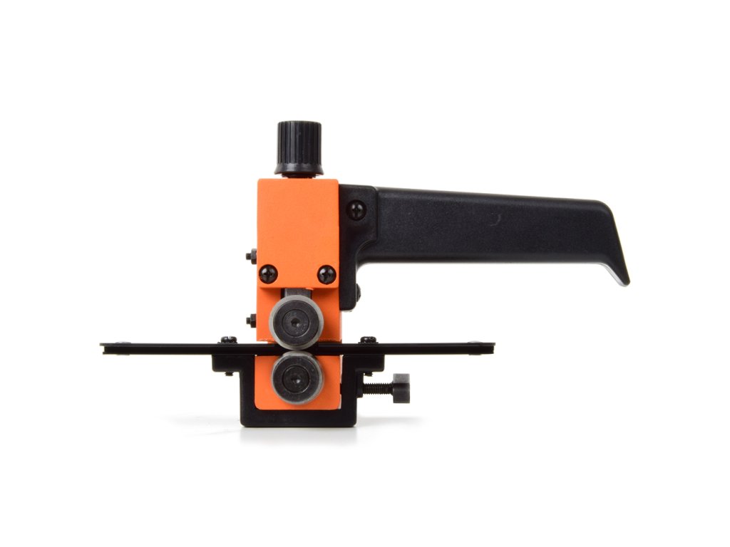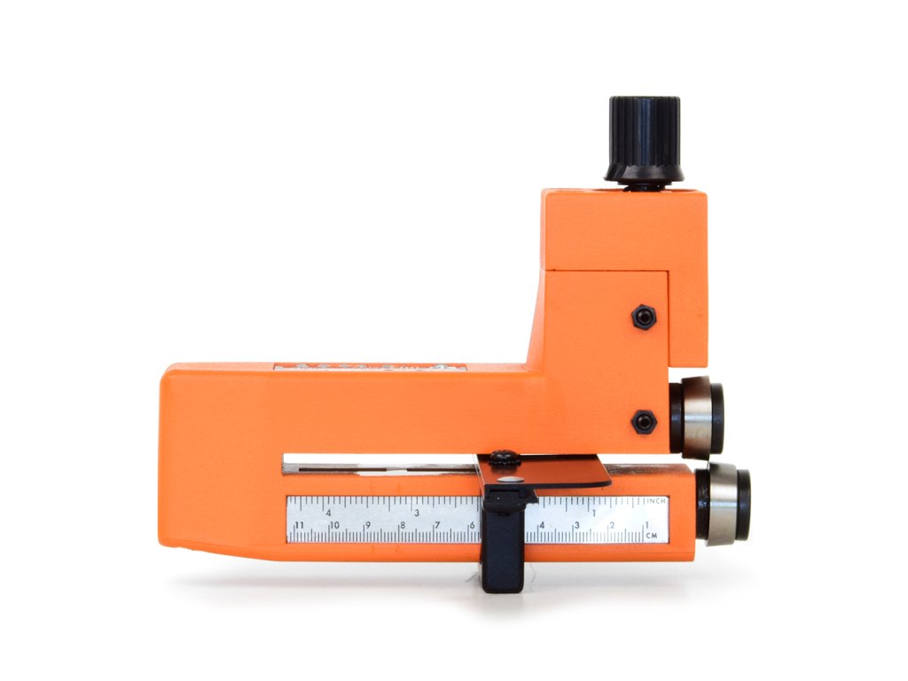 Řezačka je vhodná na řezání laminátových materiálů a dýh bez zbytečného odpadu. Materiál vložíte do přípravku a pohybem podél hrany jej odřežete. Dvě protilehlé ocelové čepele řežou materiál přesně podél hrany. Pomocí ovládacího kolečka můžete snadno nastavovat tloušťku materiálu. Šířku řezu nastavíte pomocí pravítka na straně přípravku.