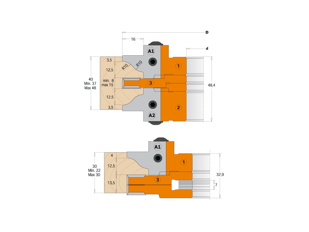 Tento nástroj je určen k výrobě interiérových dveří z měkkého a tvrdého dřeva. Frézovací hlava je velice všestranná, neboť do ní lze upnout pět různých profilových žiletek, s nimiž vyrobíte nejžádanější profily. Stavitelnou drážkovací frézu, která je také součástí sestavy, lze použít samostatně k frézování drážek o tloušťce 8 až 15 mm. S touto jedinečnou CMT frézou vyrobíte profil rámu pro výplně i pro sklo. Určeno k použití se spodní frézkou. Výborně se hodí pro tvrdé a měkké dřevo o maximální tloušťce 48 mm.