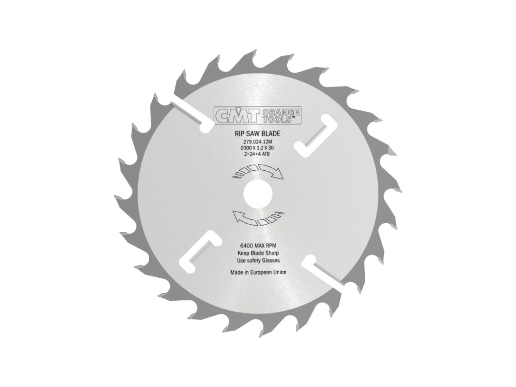 CMT Rozmítací kotouč s vyklizovacím zubem D300x3,2 d60 Z24+4 MEC HM se střídavě šikmými tvrdokovovými zuby a speciálními vyklizovacími zuby pro rozmítání masivního dřeva, suchého i vlhkého s vlhkostí přes 10 %. Povrch kotouče je lakovaný pro zvýšenou odolnost proti korozi. Vyklizovací zub omezuje kontakt těla kotouče s materiálem, čímž zamezuje svírání dřeva. Určeno pouze pro strojní posuv (MEC).