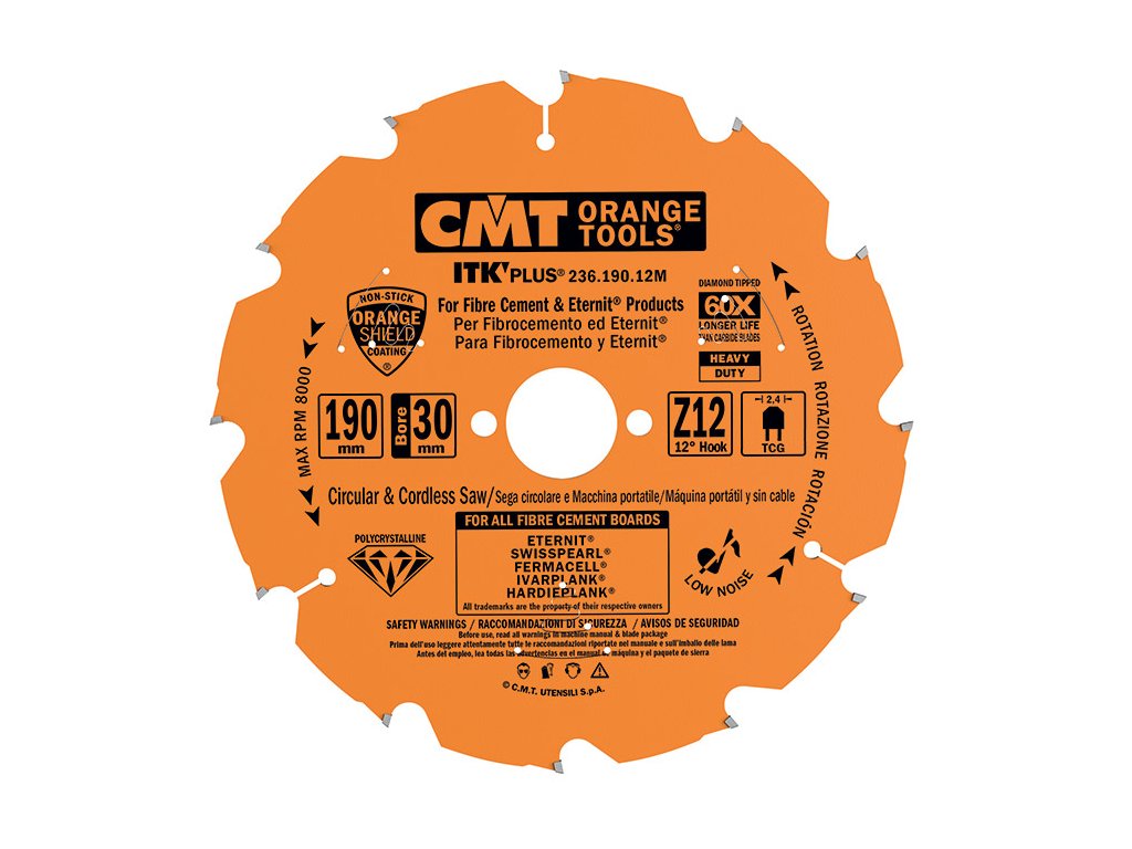 Diamantový kotouč CMT pro řezání velmi tvrdých materiálů, jako DuPont Corian®, cementotřískové a cementovláknité desky (Cetris, Eternit®, Swisspearl®, Fermacell®, Ivarplank®, Hardieplank®), MDF, DTD, termoplasty a sádrokarton. Kotouče se osazují do pokosových a zkracovacích, ručních elektrických nebo akumulátorových pil. Břity jsou z diamantových destiček vysoké životnosti.