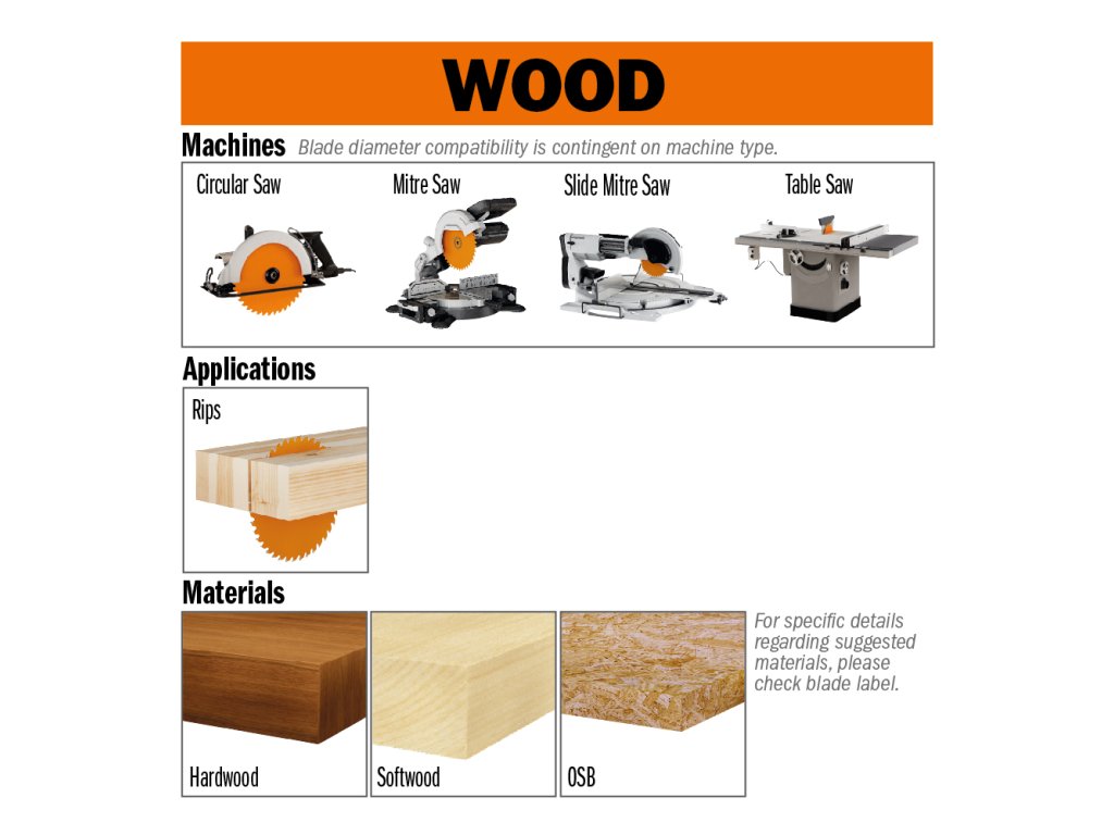 Pilový kotouč se střídavě šikmými tvrdokovými zuby HW pro podélné řezy tvrdého a měkkého dřeva. Teflonový povrch kotouče Orange Shield Coating poskytuje vysokou ochranu proti korozi, zabraňuje ulpívání pilin a pryskyřice na kotouči a lépe odvádí teplo. Zub s omezovačem třísky zabraňuje zpětnému rázu. Expanzní drážky zaručují rovný řez.