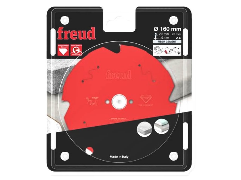 Diamantový kotouč FREUD pro řezání velmi tvrdých materiálů, jako DuPont Corian®, cementotřískové a cementovláknité desky (Cetris, Eternit®, Swisspearl®, Fermacell®, Ivarplank®, Hardieplank®), MDF, DTD, termoplasty a sádrokarton. Kotouče se osazují do pokosových a zkracovacích, ručních elektrických nebo akumulátorových pil. Břity jsou z diamantových destiček vysoké životnosti.