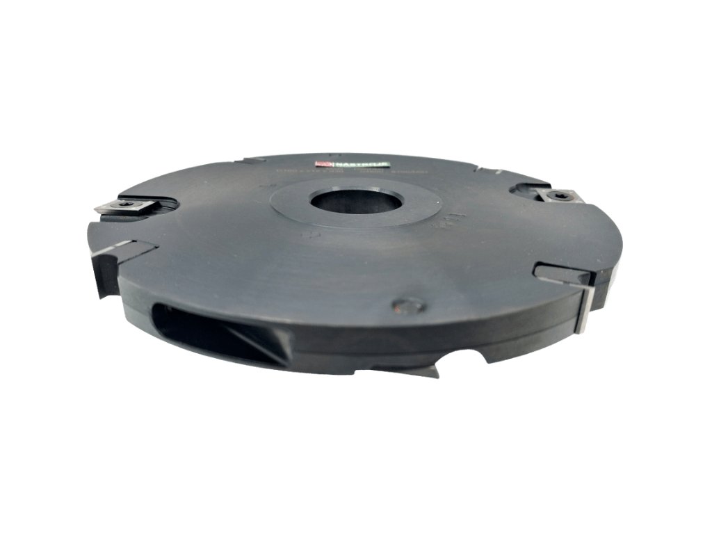 Profesionální drážkovací fréza s ocelovým tělem, osazená 4 výměnnými břitovými destičkami a 4 oboustrannými předřezy, zajišťuje čistý a přesný řez v široké škále dřevěných materiálů. Díky tvrdokovovým žiletkám nabízí dlouhou životnost a ekonomický provoz – po otupení stačí destičky jednoduše otočit nebo vyměnit. Předřezy minimalizují vytrhávání vláken na hranách drážky a zlepšují kvalitu povrchu.