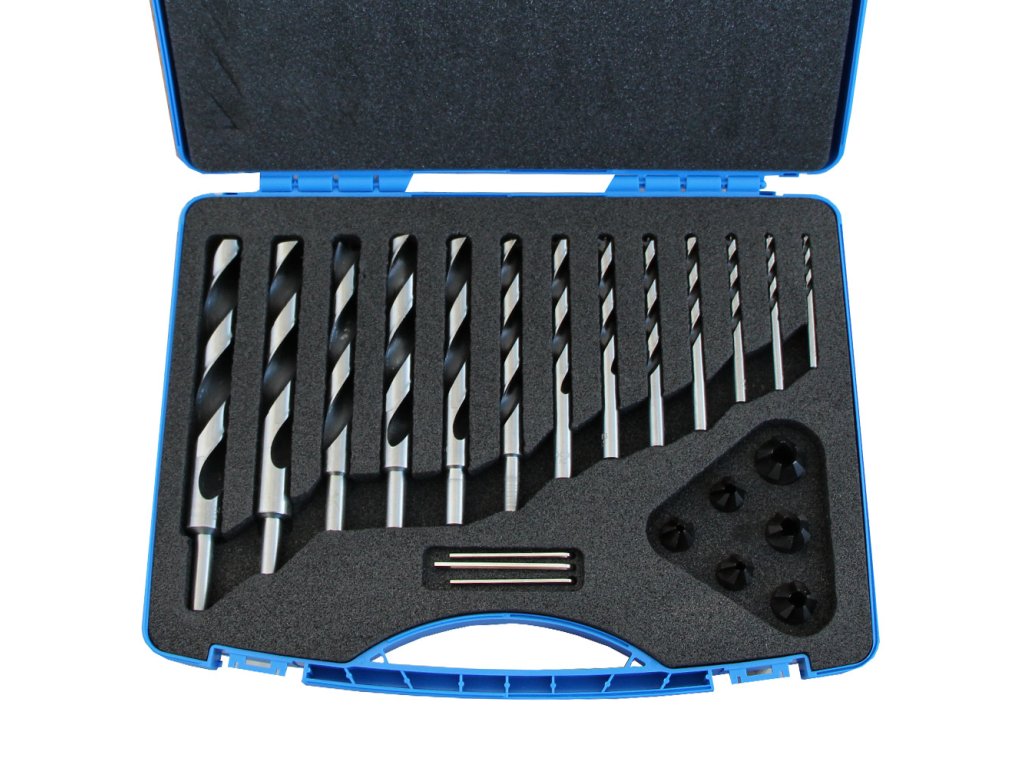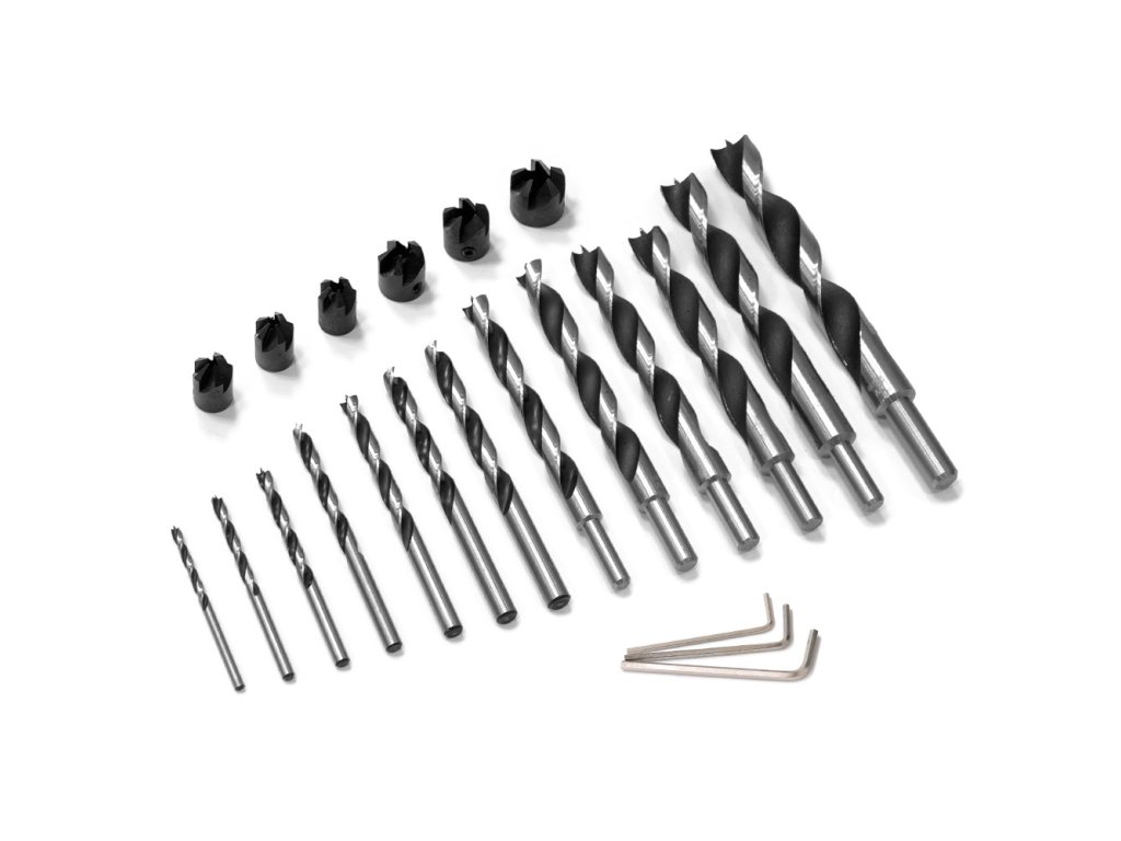 Sada vrtáků s vodícím hrotem a záhlubníků včetně inbusových klíčů pro montáž záhlubníků.
