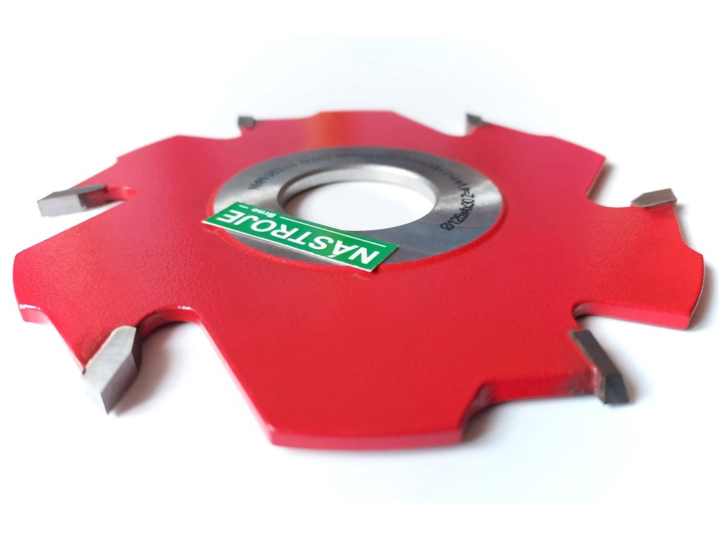 Drážkovací fréza s SK pájenými rovnými břity a předřezy s ocelovým tělem. Předřezávací zuby zvyšují kvalitu obrábění. Fréza je vhodná pro frézování masivu, překližky a laťovky. Drážkovačka je určena pro spodní frézky.