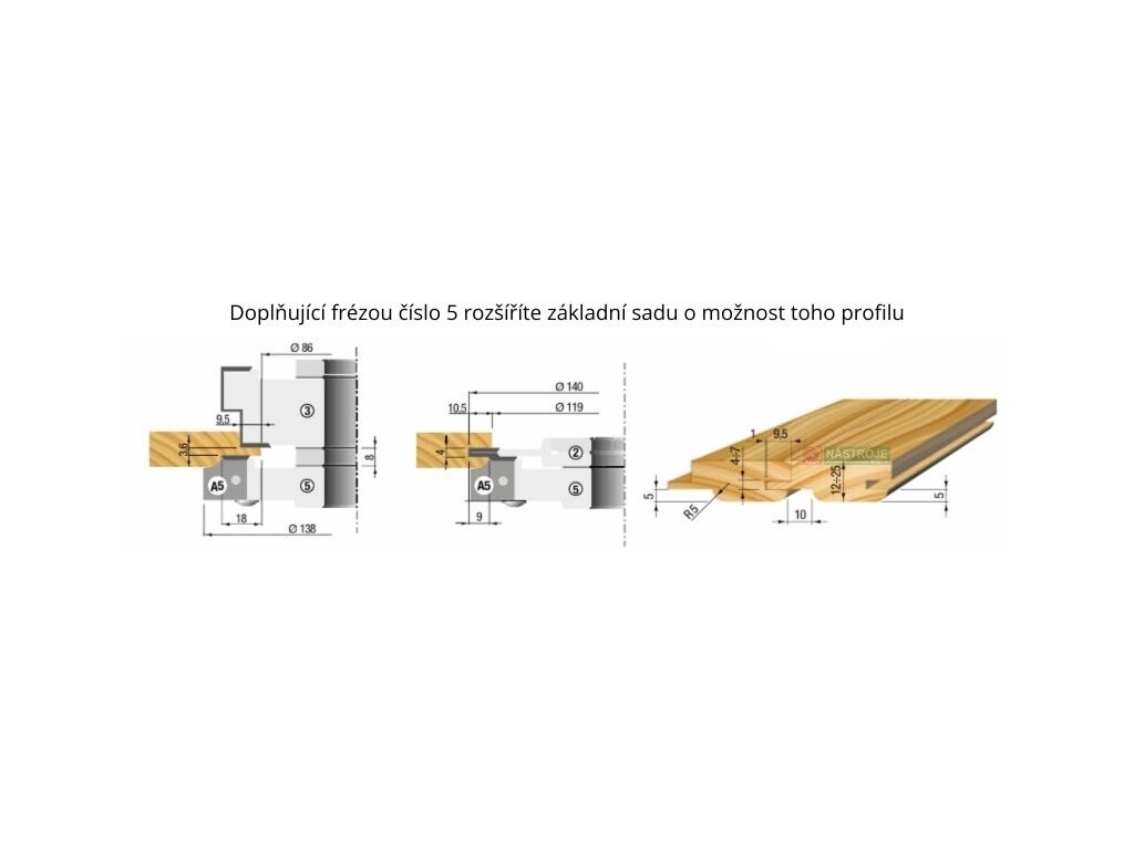 Profilování s větší spárou: Tato doplňující fréza umožňuje frézovat palubky s větší spárou, což je ideální pro aplikace, kde je vyžadována lepší ventilace nebo estetický vzhled s výraznějšími mezerami.