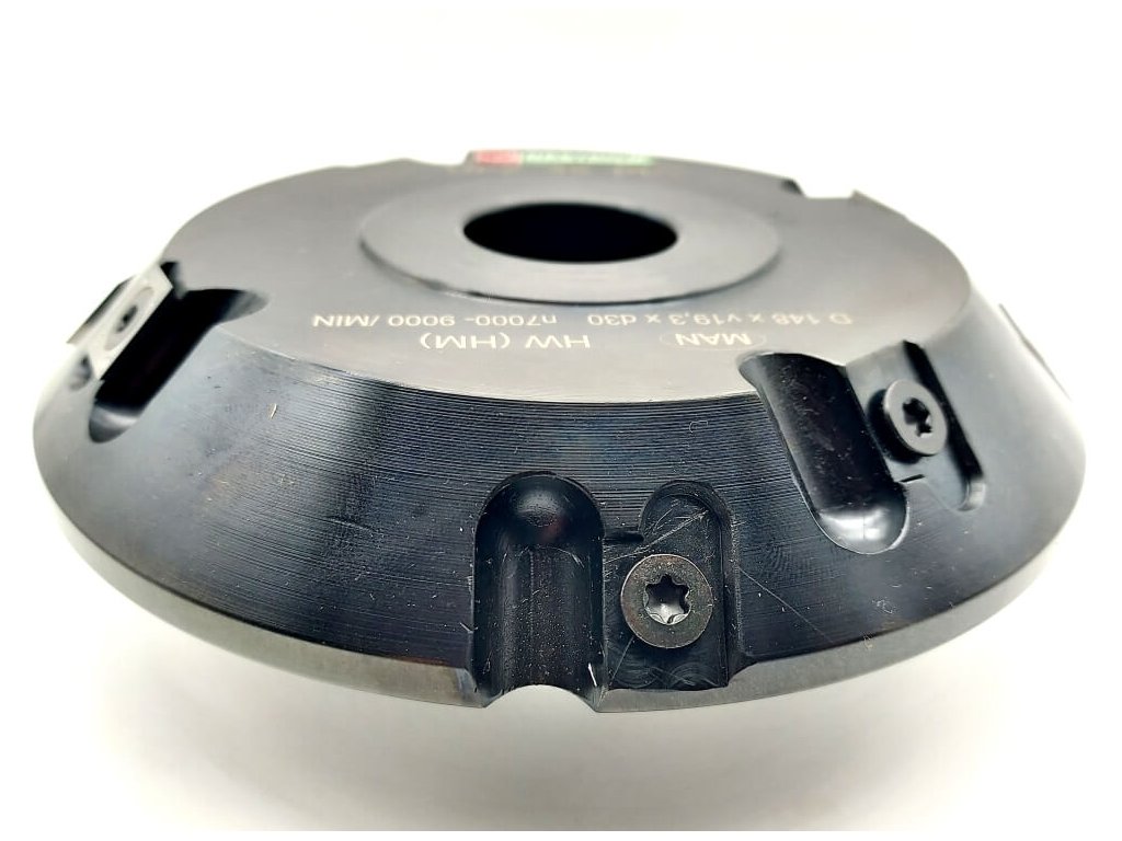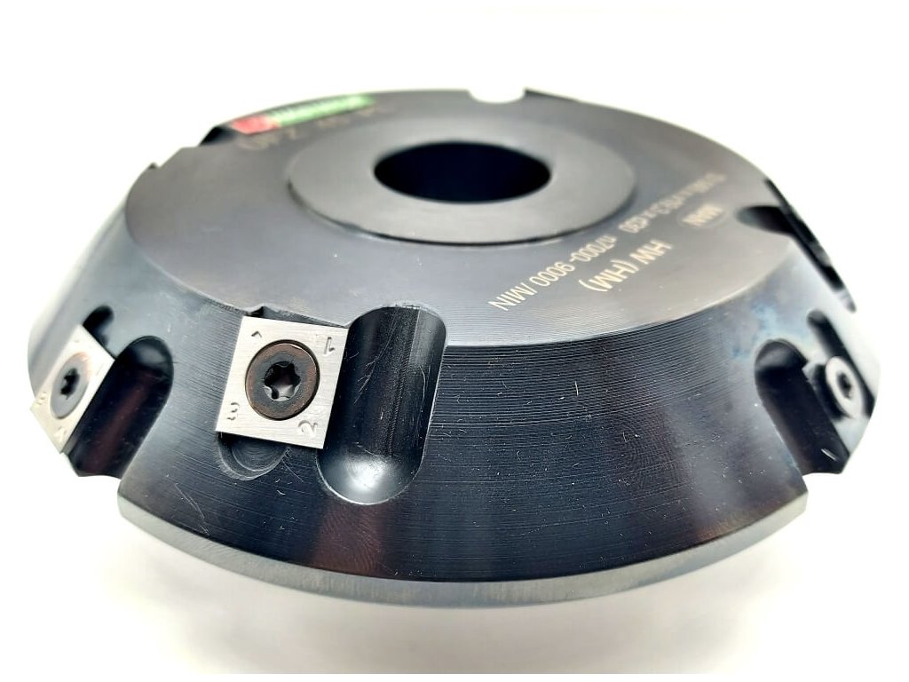 Úhlová fréza s 4 otočnými tvrdokovovými SK (HM) výměnnými žiletkami, které lze opakovaně ostřit. Fréza má nožová lůžka pro horní i spodní braní, stačí přemontovat žiletky a tím má fréza opačný chod z pravotočivého na levotočivý.