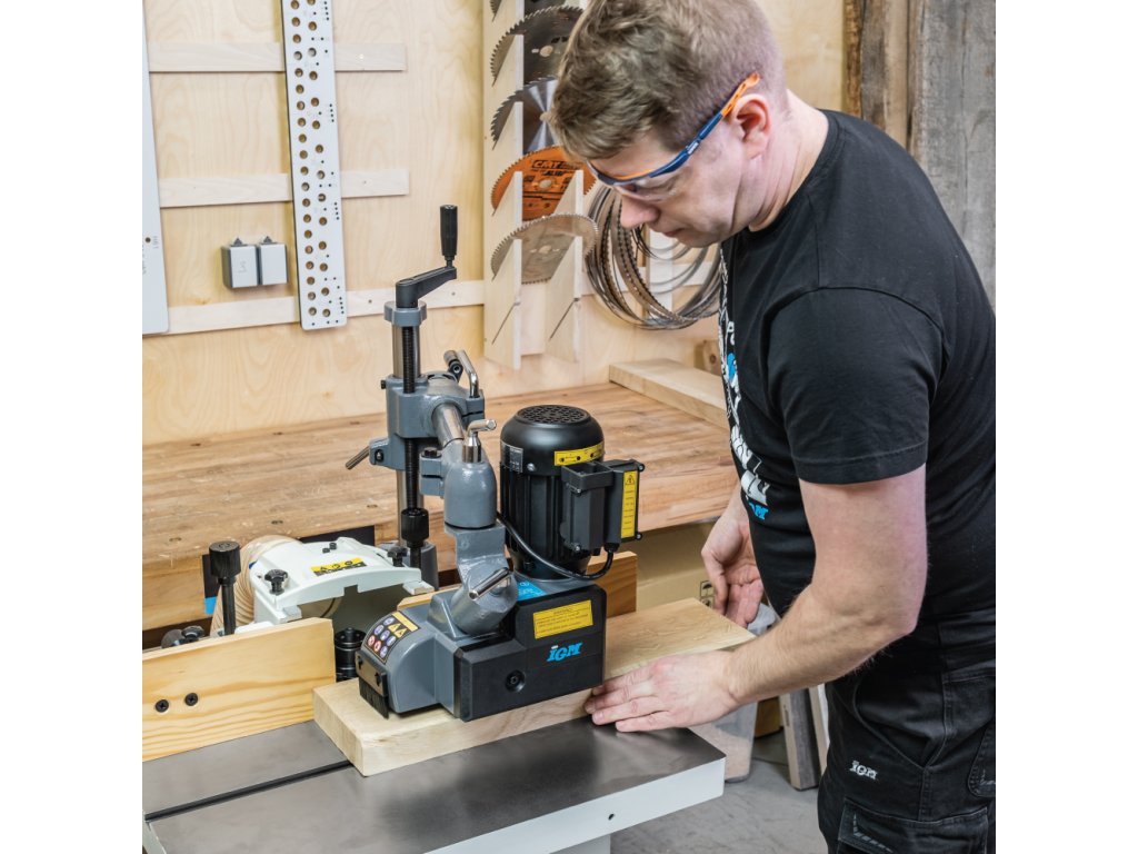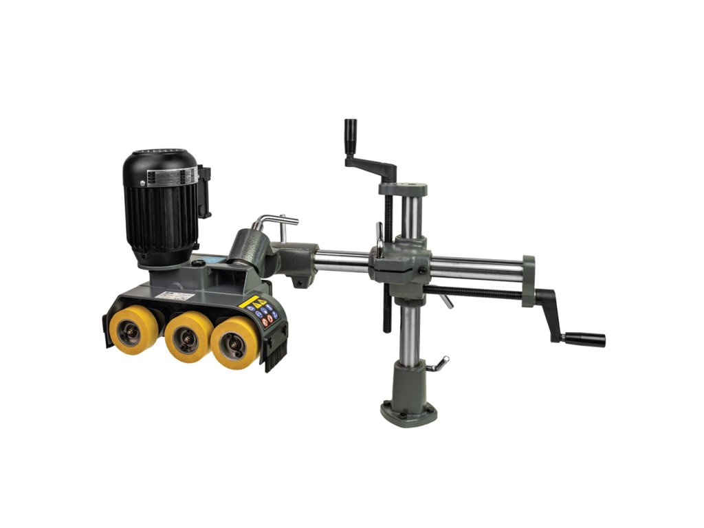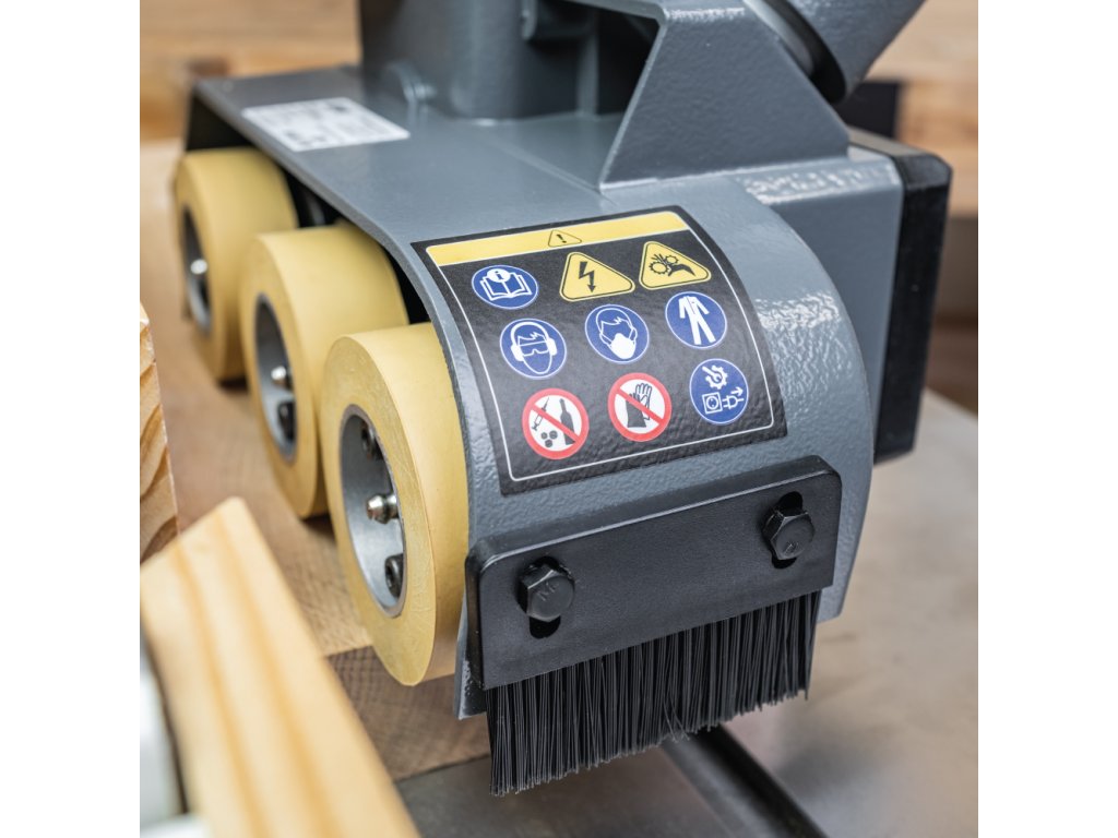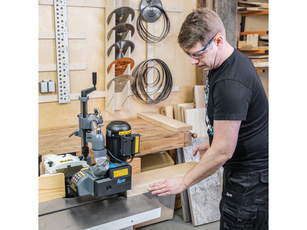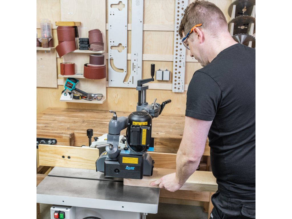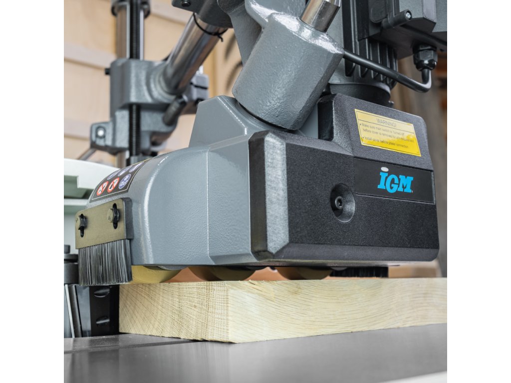 Střední kategorie podavače materiálu se třemi odpruženými rolnami, které mají výbornou přilnavost a skvěle se vyrovnávají s nerovnostmi. Je ideální pro konstantní posuv při frézování nebo řezání dřeva i jiných materiálů. Volit můžete ze čtyř rychlostí podávání, které se mění pozicí ozubených kol po sejmutí krytu. Zpětný chod se ovládá ručním ovladačem. Vodorovná i svislá poloha podavače se nastavuje na universálním stojanu pomocí dvou ovládacích šroubů a poté se bezpečně zajistí. Hlavu podavače lze otáčet o 90°, takže jej lze použít k vodorovnému nebo svislému tlaku na materiál. Může být namontován přímo ke stroji šrouby (nutno vrtat díry do stolu) nebo pomocí IGM Instalační desky pro podavače. Pro použití na malé a střední frézce nebo srovnávačce či kotoučové pile pro středně-lehké práce například frézování rámečků a výplní. Je vyroben ze stejných materiálů jako vyšší modely, což zaručuje dobrý poměr cena - výkon.