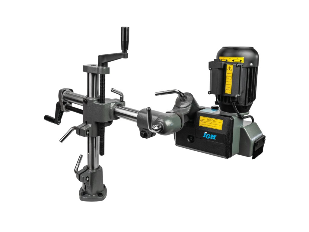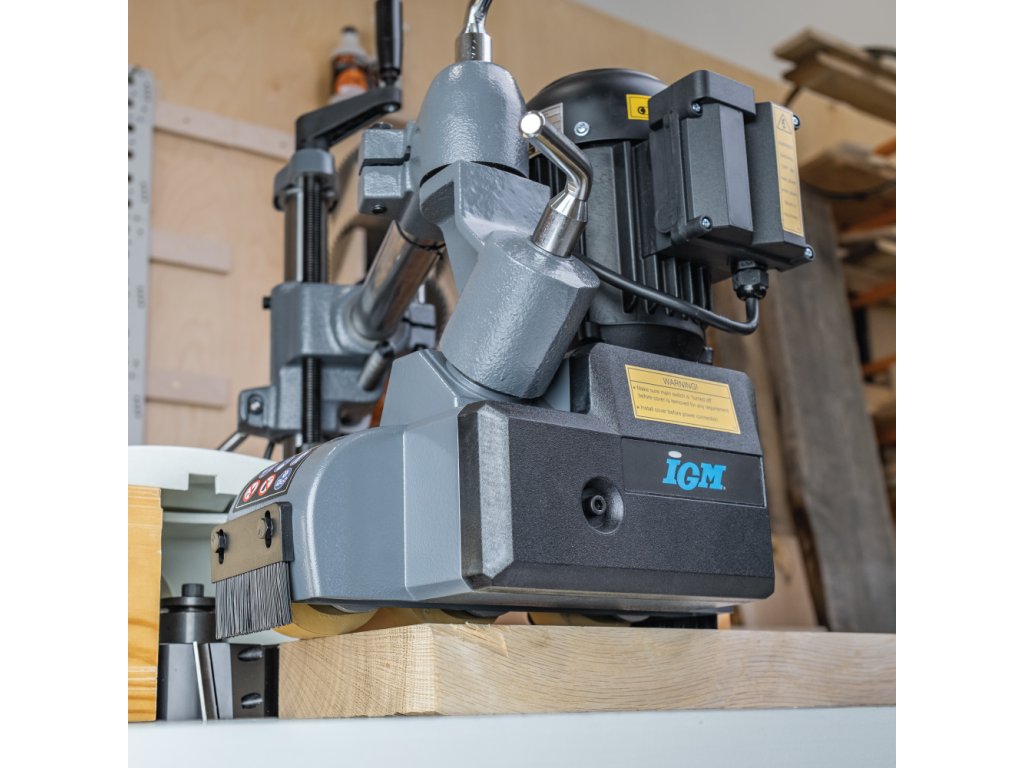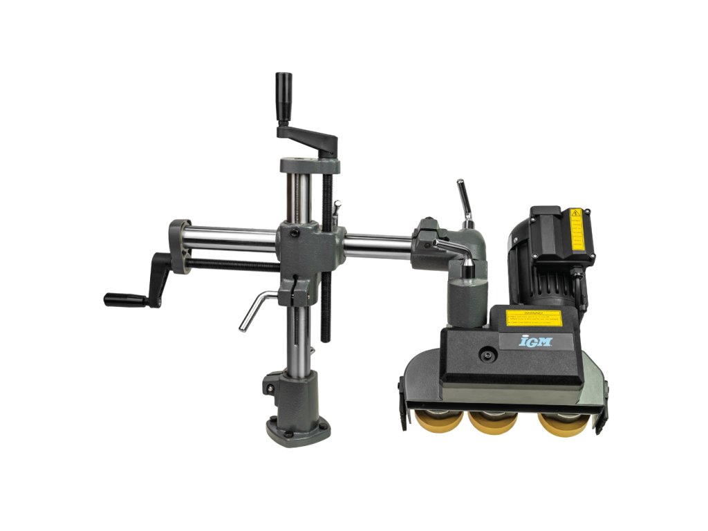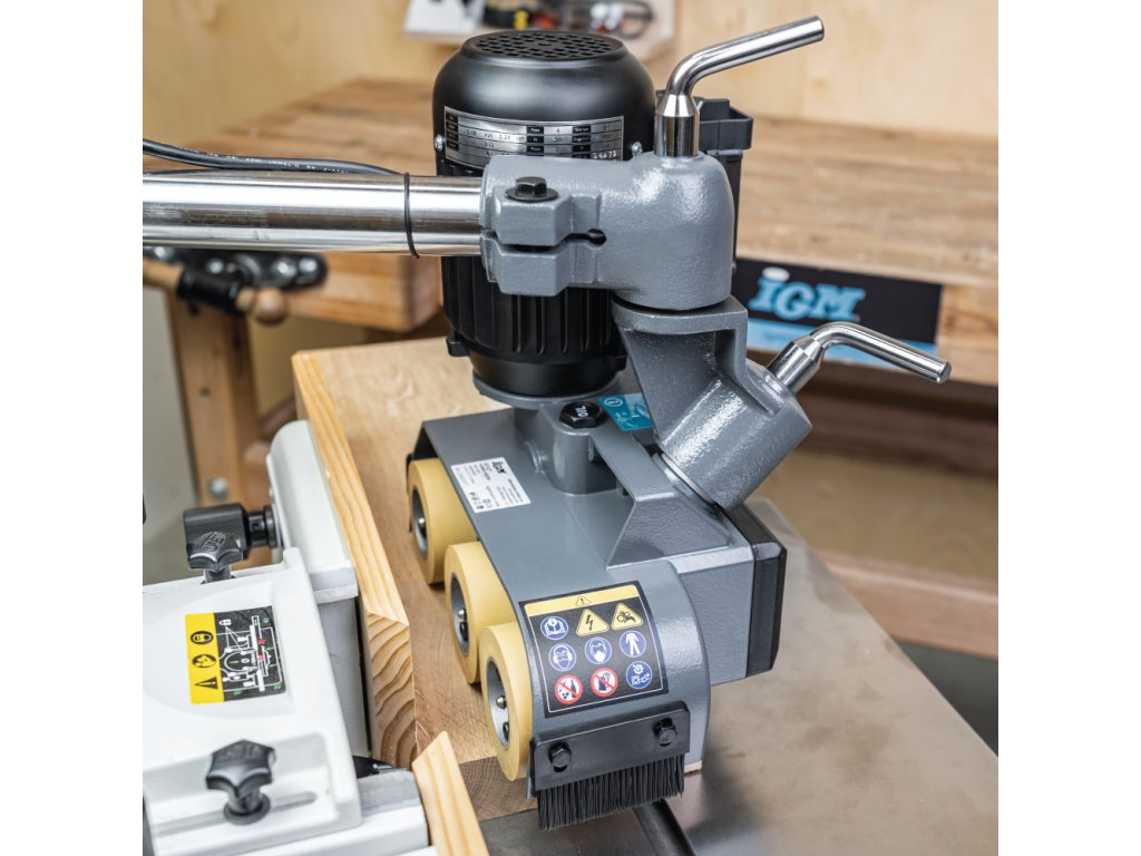 Střední kategorie podavače materiálu se třemi odpruženými rolnami, které mají výbornou přilnavost a skvěle se vyrovnávají s nerovnostmi. Je ideální pro konstantní posuv při frézování nebo řezání dřeva i jiných materiálů. Volit můžete ze čtyř rychlostí podávání, které se mění pozicí ozubených kol po sejmutí krytu. Zpětný chod se ovládá ručním ovladačem. Vodorovná i svislá poloha podavače se nastavuje na universálním stojanu pomocí dvou ovládacích šroubů a poté se bezpečně zajistí. Hlavu podavače lze otáčet o 90°, takže jej lze použít k vodorovnému nebo svislému tlaku na materiál. Může být namontován přímo ke stroji šrouby (nutno vrtat díry do stolu) nebo pomocí IGM Instalační desky pro podavače. Pro použití na malé a střední frézce nebo srovnávačce či kotoučové pile pro středně-lehké práce například frézování rámečků a výplní. Je vyroben ze stejných materiálů jako vyšší modely, což zaručuje dobrý poměr cena - výkon.