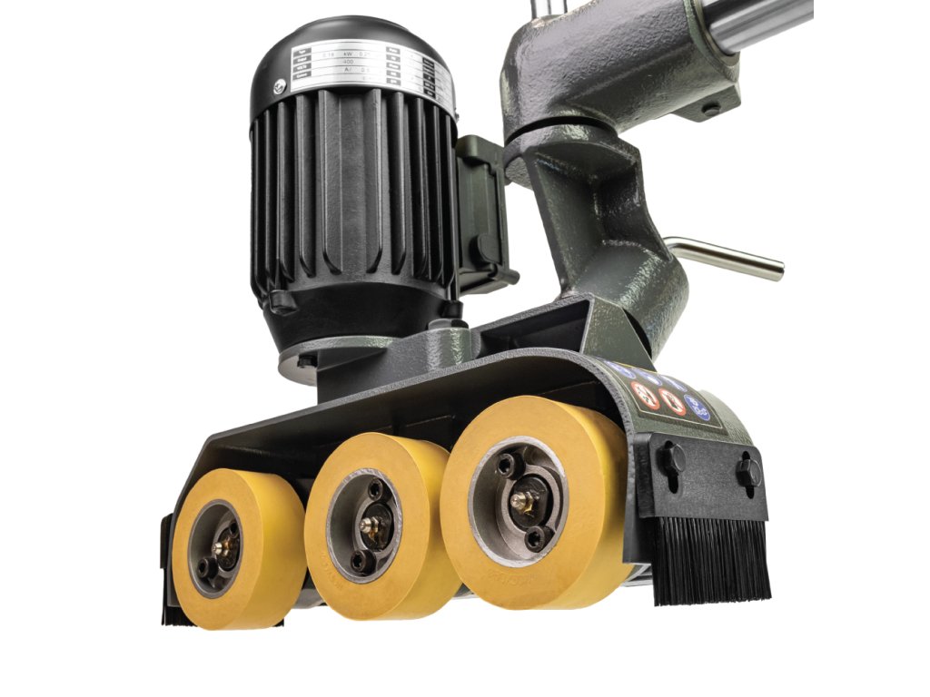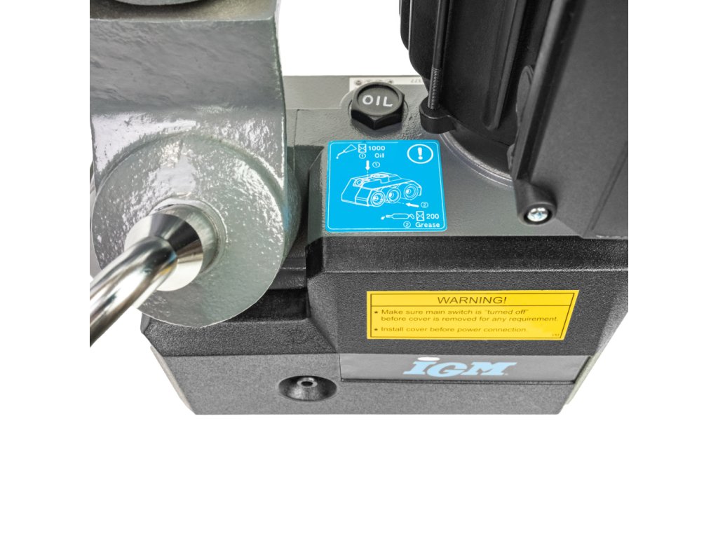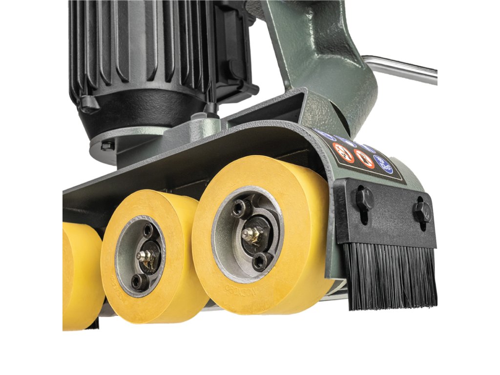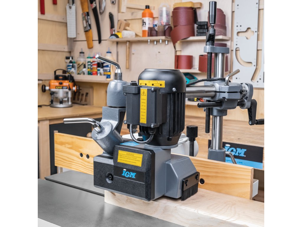 Střední kategorie podavače materiálu se třemi odpruženými rolnami, které mají výbornou přilnavost a skvěle se vyrovnávají s nerovnostmi. Je ideální pro konstantní posuv při frézování nebo řezání dřeva i jiných materiálů. Volit můžete ze čtyř rychlostí podávání, které se mění pozicí ozubených kol po sejmutí krytu. Zpětný chod se ovládá ručním ovladačem. Vodorovná i svislá poloha podavače se nastavuje na universálním stojanu pomocí dvou ovládacích šroubů a poté se bezpečně zajistí. Hlavu podavače lze otáčet o 90°, takže jej lze použít k vodorovnému nebo svislému tlaku na materiál. Může být namontován přímo ke stroji šrouby (nutno vrtat díry do stolu) nebo pomocí IGM Instalační desky pro podavače. Pro použití na malé a střední frézce nebo srovnávačce či kotoučové pile pro středně-lehké práce například frézování rámečků a výplní. Je vyroben ze stejných materiálů jako vyšší modely, což zaručuje dobrý poměr cena - výkon.