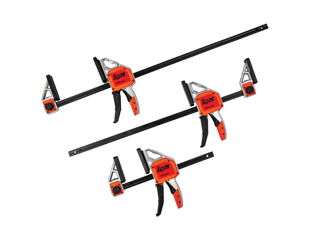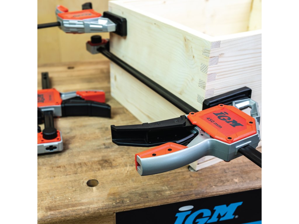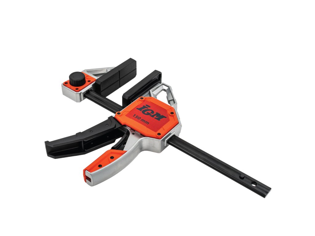 IGM ALU Rychloupínací svěrka je určená pro profesionály i kutily, kteří potřebují ve své dílně robustní truhlářskou svěrku pro větší zatížení. Čelisti svěrky s hloubkou 95 mm jsou vyrobené z hliníku a mají velké podložky o rozměru 90x36 mm z měkkého plastu. Vodící tyč 6x19 mm je vyrobena z uhlíkové oceli. Svěrka je vybavena páčkou pro rychloupínání a odnímatelnou čelistí pro přeměnu na rozpěrku pomocí otočného tlačítka. Maximální upínací síla až 140 kg.