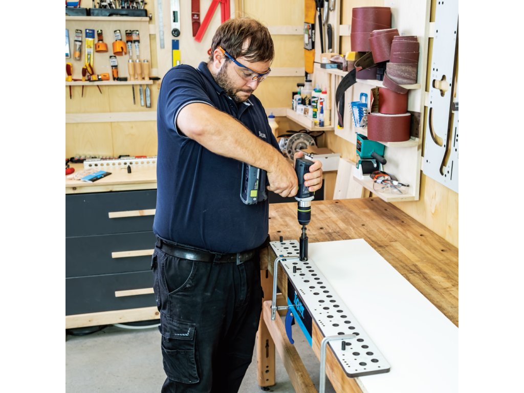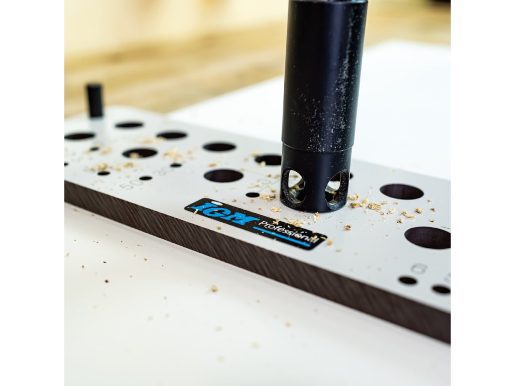 Práce se šablonou je velmi rychlá. Na vrtacím vřeteni nastavíte hloubku vrtání a upnete do Vaší vrtačky. Vložíte přípravek na desku, opřete o dorazy a upnete svěrkami nebo jen pevně přidržíte druhou rukou. Díky kolíkovacímu vrtáku s vodícím hrotem a předřezy vyvrtáte otvory snadno, přesně a bez otřepů na okraji otvoru. Je to prostě jednoduché a velmi rychlé.