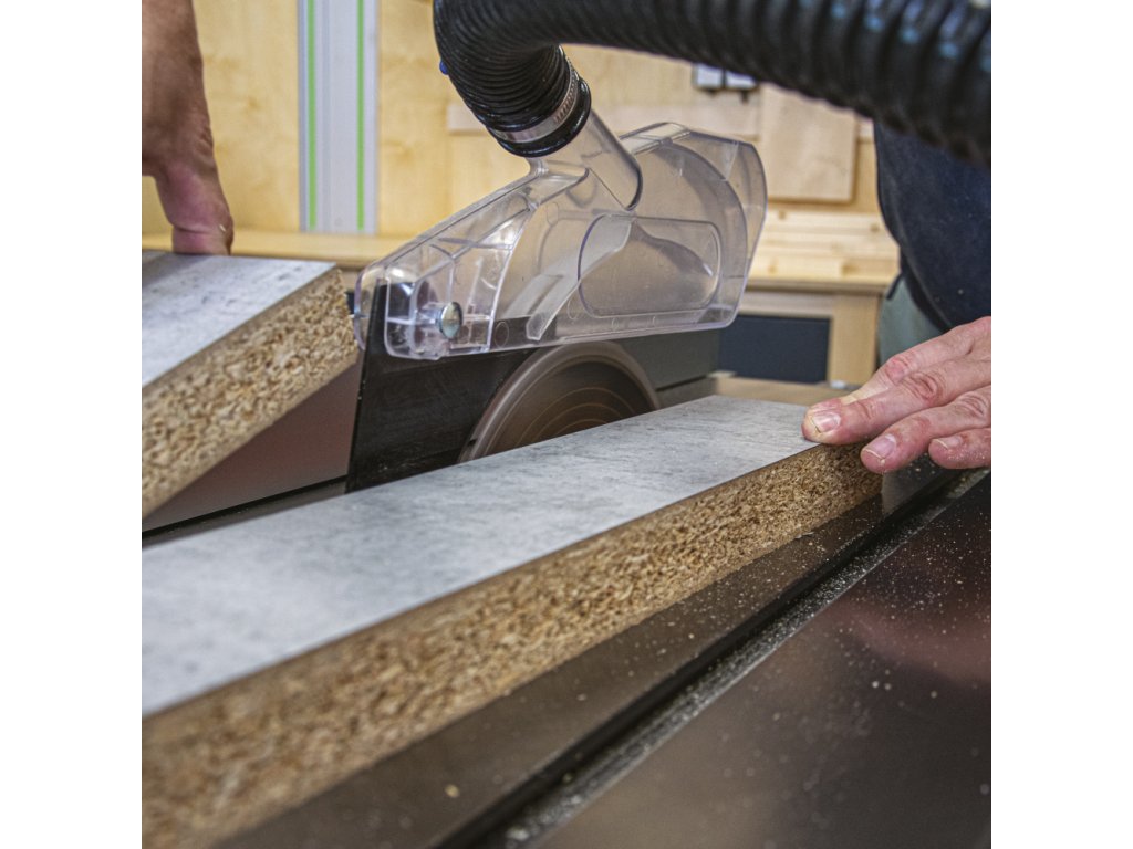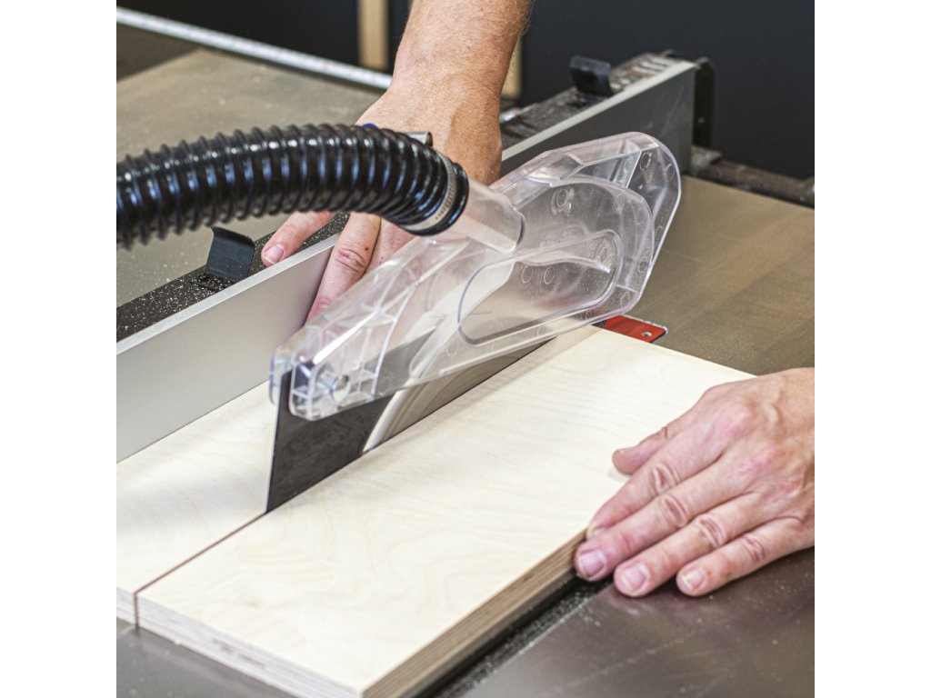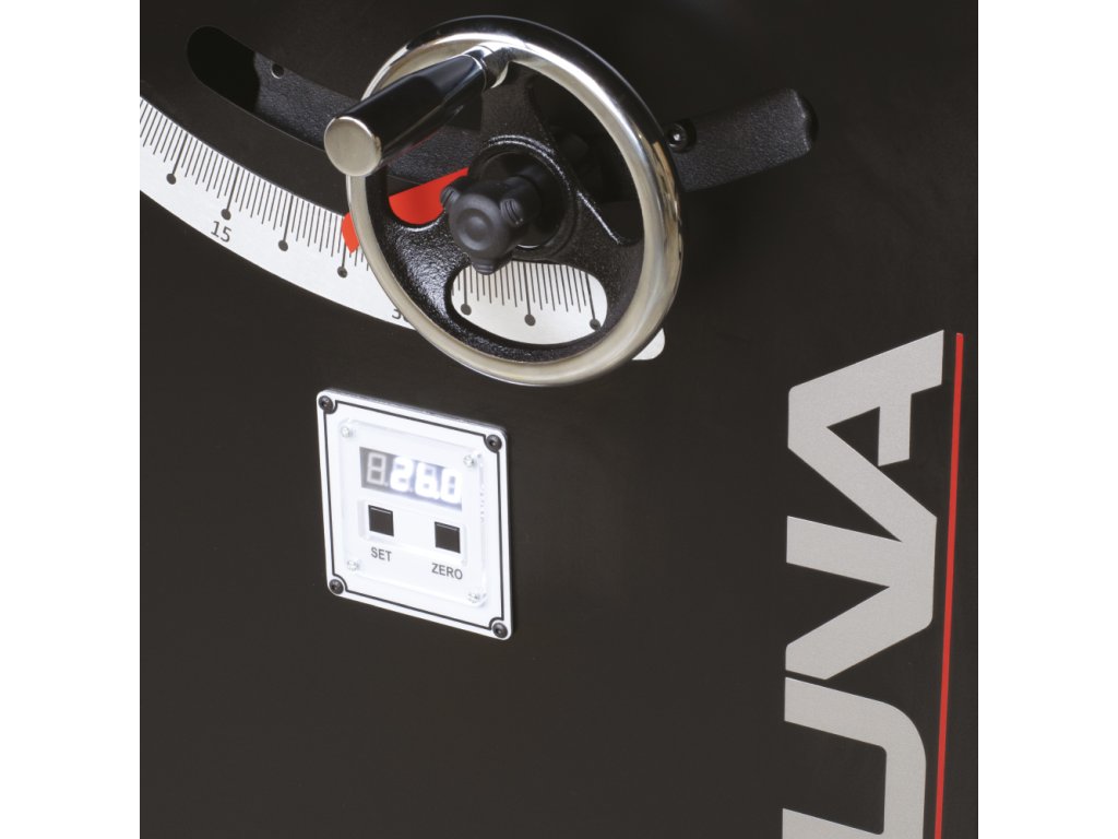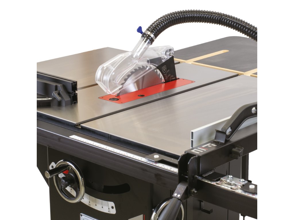 Litinová ovládací kola s rukojetí a uzamčením proti protočení zajišťují lehké a přesné naklopení pilového kotouče od 0° do 45° a zdvih pilového kotouče nahoru a dolů podle vaší potřeby. Pila je navíc vybavena přesným digitálním ukazatelem úhlu pilového kotouče s podsvíceným displejem, který je zabudovaný v těle pily z přední strany. Pila má důmyslně řešené odsávání pilin ze spodní části i z horního odsávacího krytu od pilového kotouče. Odsávání prachu umístěné v krytu pilového kotouče poskytuje čistou pracovní plochu pro přesné a komfortní řezání. Pro připojení odsavače pilin je v zadní části těla zabudované 100 mm kovové hrdlo.