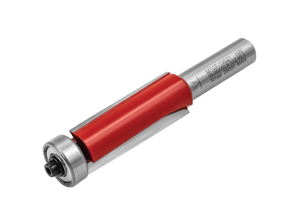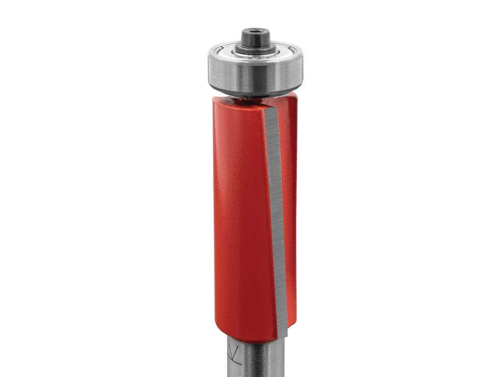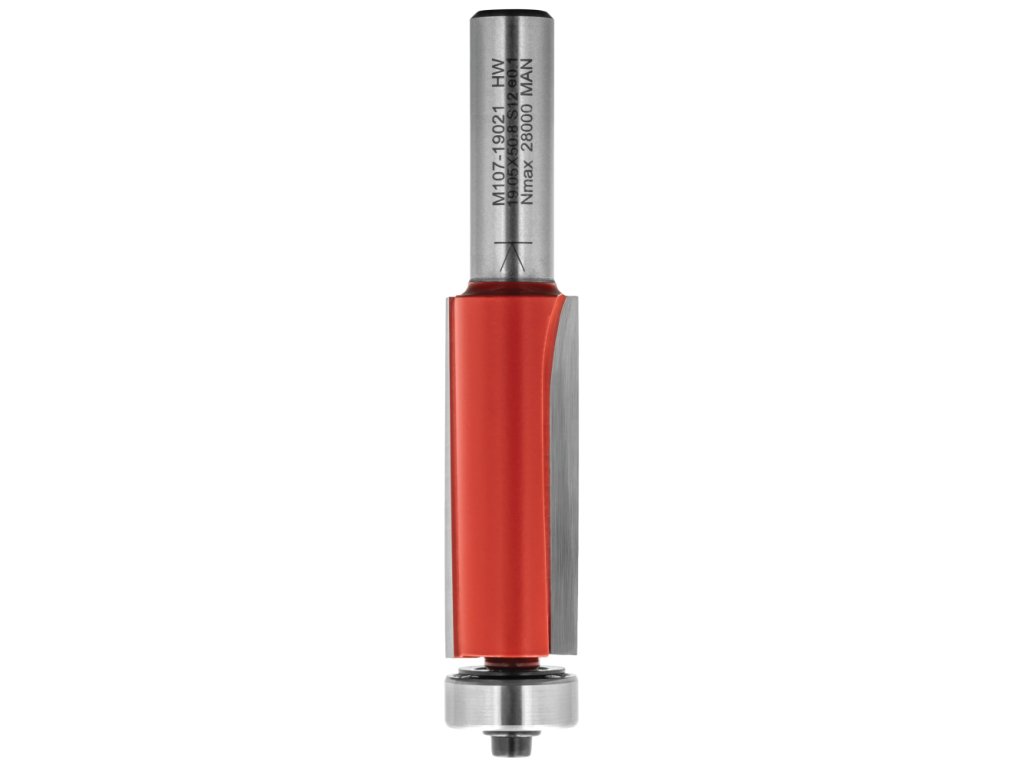 Fréza má šikmé zuby pro čistší řez při ořezávání i nejobtížnějších dílů podle šablony. HM tvrdokovové břity. Kopírovací ložisko na čele frézy.