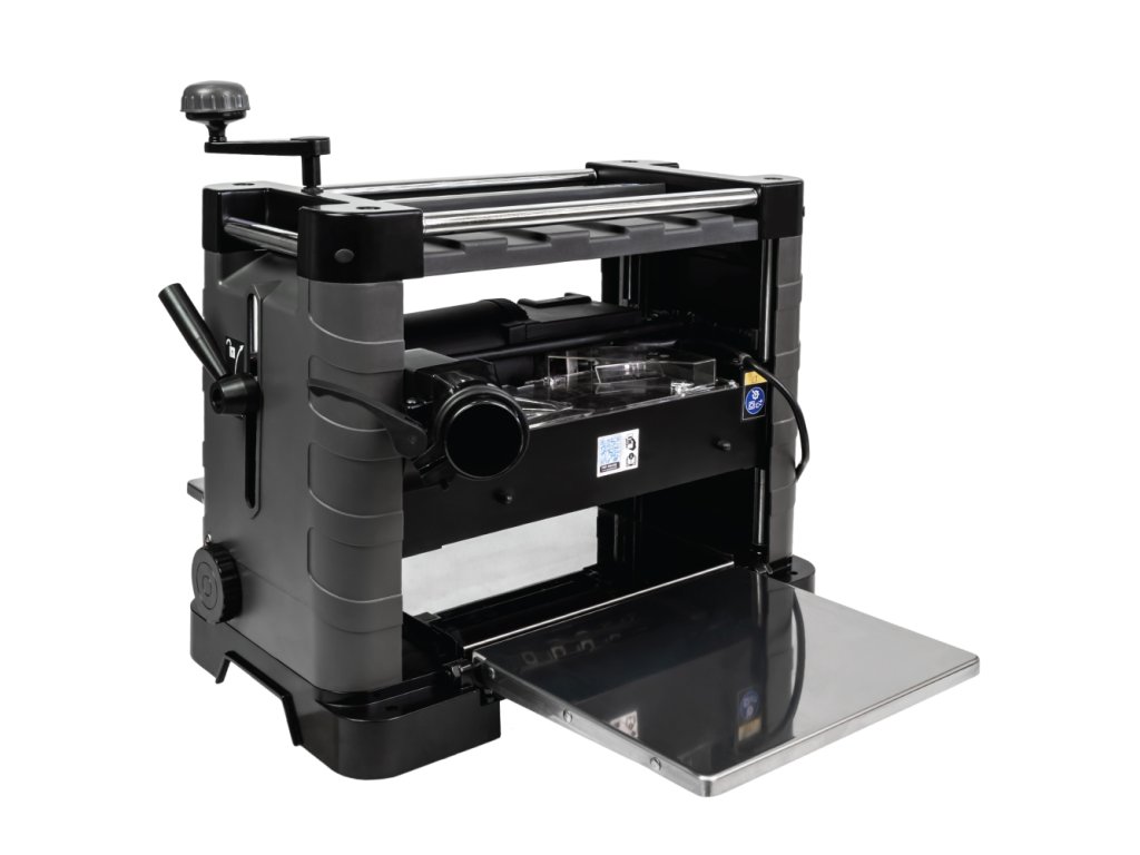 První stolní tloušťkovačka se spirálovým válcem s tvrdokovovými žiletkami na evropském trhu. Přesně opracovaná spirálová hoblovací hlava s 36 tvrdokovovými žiletkami osazenými ve 4 spirálách pro maximální čistotu a efektivitu opracování. Spirálová hlava snadno a velmi čistě hobluje i velmi tvrdá a exotická dřeva, dřevo napříč, nevyštípává suky a hoblovaný povrch je za všech podmínek mnohem hladší než po opracování běžnými noži. Tvrdokovové žiletky mají několikanásobně vyšší výdrž proti klasickému hoblovacímu HSS noži a lze je 4x otočit pro ještě delší životnost bez výměny nebo zdlouhavého čekání na broušení a nutnosti ustavování ve válci. Stroj lze používat i bez odsavače pilin, díky integrovanému ventilátoru a prachovému sáčku, pro efektivní odvod pilin od válce. Lze zde samozřejmě připojit i průmyslový vysavač nebo odsavač prachu a pilin. Výška protahování je aretovatelná, pro maximální přesnost tloušťkování. Pro maximální bezpečnost při práci je stroj vybavený pogumovanými podávacími válci, které pevně drží a posouvají obrobek bez rizika zpětného rázu. Výkonný motor je vybavený ochranou proti přetížení a proti opětovnému spuštění při výpadku el. proudu.
