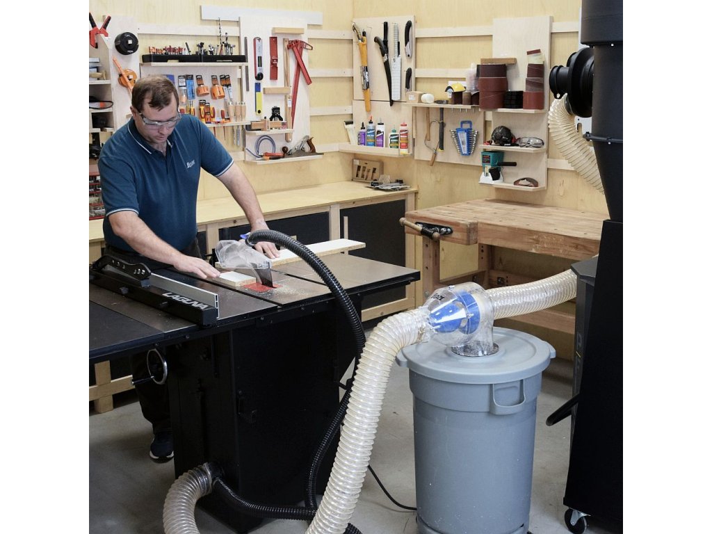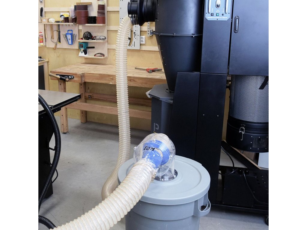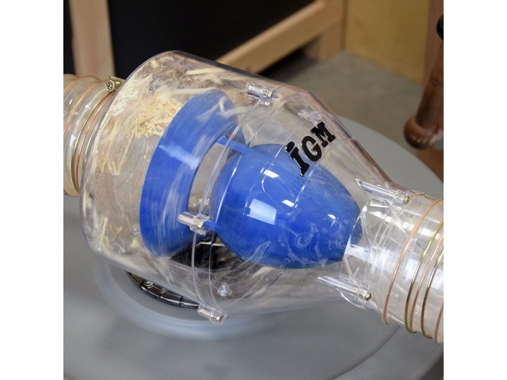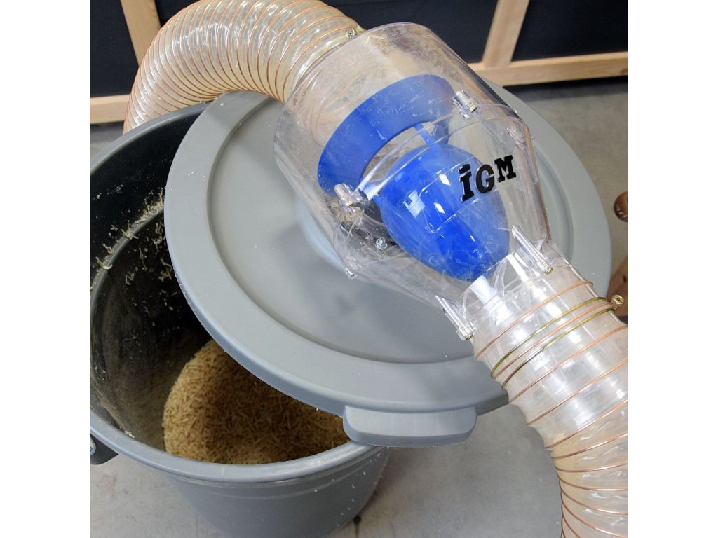 Zefektivněte odsávání v dílně s IGM Separátorem pilin a prachu. Separátor odděluje piliny, třísky a prachové částice do odpadní nádoby, čímž snižuje poškození odsavače. Propouštěním pouze jemného prachu prodloužíte životnost odsávacích hadic, filtrů a ventilátoru odsavače. Díky svému designu mají elipsovitý oddělovač a lopatky pouze malý vliv na pokles tlaku a udržují tak optimální proudění vzduchu. Separátor pilin a prachu lze připevnit na víko nádoby téměř libovolné velikosti. Součástí je vrtací šablona na víko odpadní nádoby. Pro nejlepší výkon používejte pouze s truhlářským řezivem s max. 8 % vlhkostí a vyberte vhodný stroj a rychlost posuvu materiálu tak, abyste vytvořili třísky či hobliny menší než 50 mm. Separátor je určený pro připojení mezi stroj a odsavač pilin na odsávací hadici průměru 100 mm.
