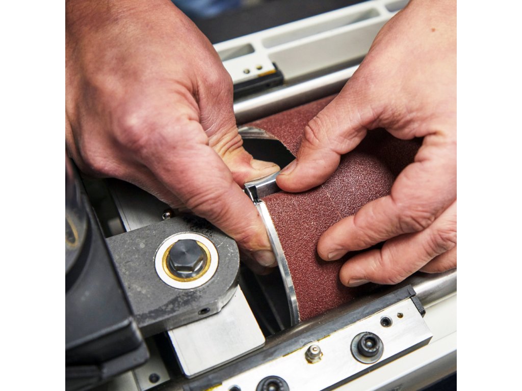 Dodáváno s mobilním podstavcem, brusným pásem zrnitosti 80 a podávacím pásem.
