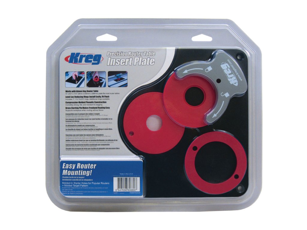 Deska je vybavena středovými kroužky Level-Loc, které vám umožňují snadno změnit velikost otvoru kolem frézovacího bitu. Kroužky namontujete na desku pomocí dodávaného klíče.