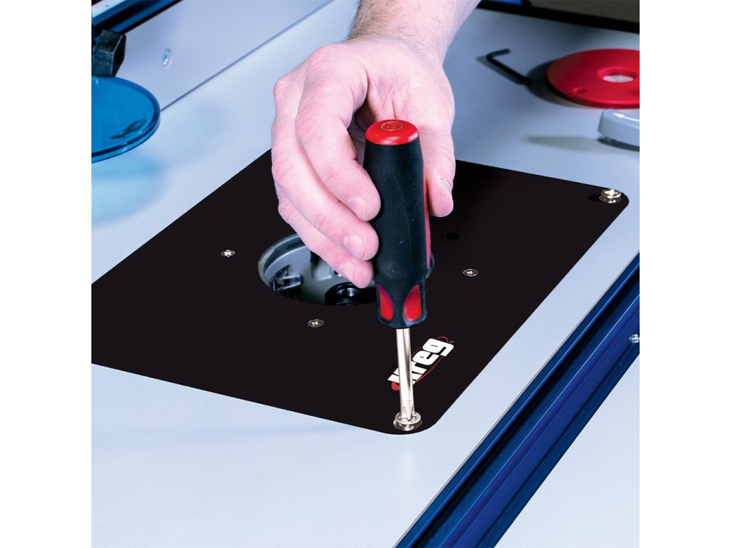 Frézovací deska 9 x 235 x 298 mm si snadno poradí s velkými frézkami. Redukční kroužky Level-Loc se namontují do desky pomocí dodávaného klíče tak, že budou vždy s deskou v perfektní rovině. Mosazný vodící čep zabezpečí vhodnou polohu frézy při frézování.