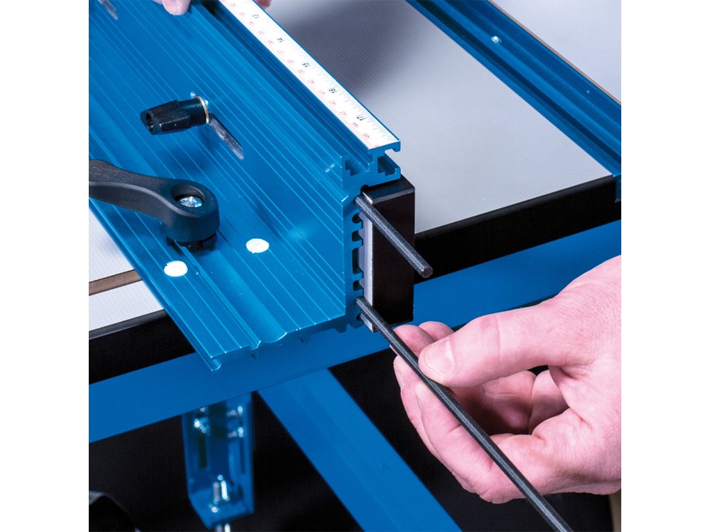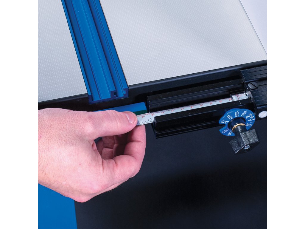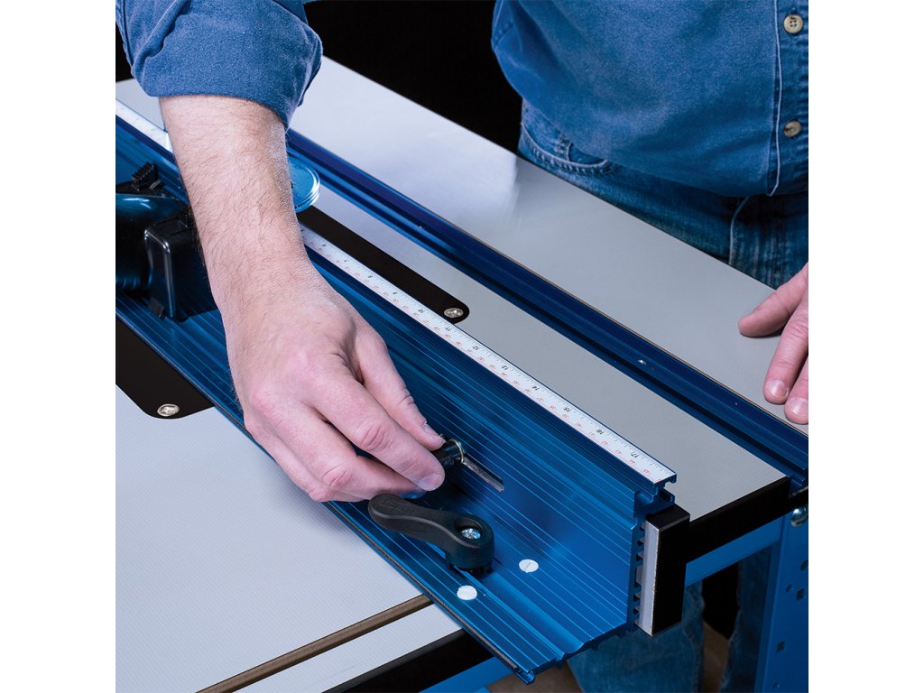 • Podélné pravítko 914 mm z odolného eloxovaného hliníku s T-drážkou a s posuvnými lícnicemi s laminátovým povrchem a dvojitou aretací.