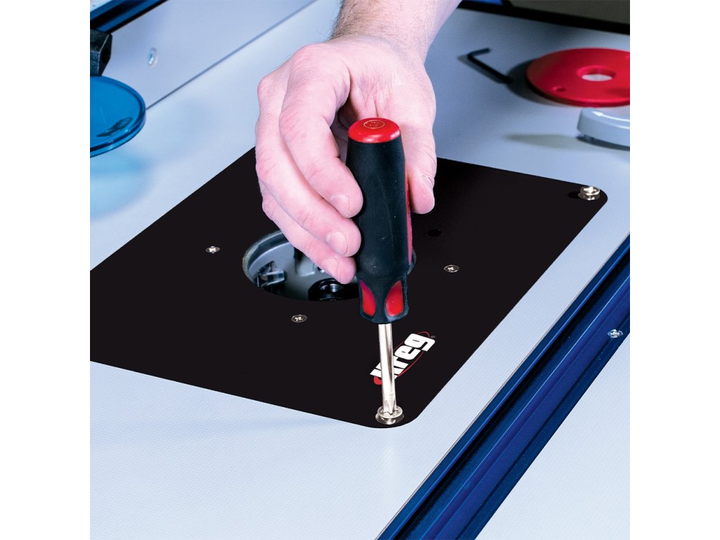 Pravítko a frézovací deska leží na velkém, odolném frézovacím stole o rozměrech 609 x 813 x 25 mm. Stůl je vyrobený z MDF pro lepší tlumení vibrací a celkovou stabilitu. S obrobkem lze po desce snadno posouvat díky tvrdému povrchu z vysokotlakého laminátu HPL. Pod deskou se nachází ocelové výztuhy, které Vám zajistí rovinnost stolku i po dlouhodobém užívání.