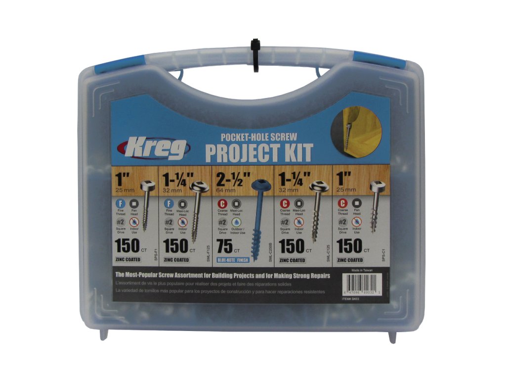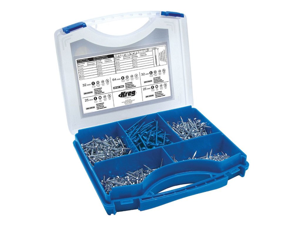 Projekt sada obsahuje pět nejpoužívanějších Kreg Šroubů pro skryté spoje, uložených v pevném pouzdře. Vhodné pro začátečníky s Kreg přípravky.