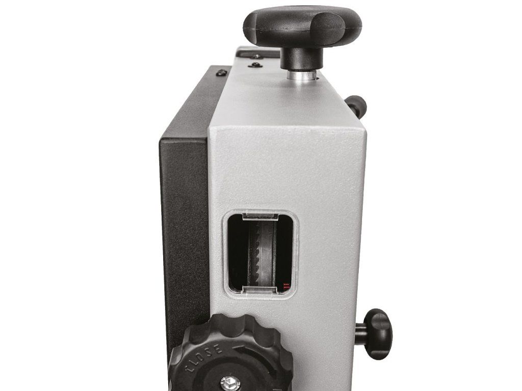 Elegantní a promyšlený design doplňují precizně zpracované díly z červeně eloxovaného hliníku, které nejen dobře vypadají, ale zajišťují i dlouhou životnost a přesnost při práci. Pilový pás o šířce 3 až 13 mm je vedený červeným vodítkem a prochází skrz ložiskové vedení, díky kterému si vedení pásu přesně seřídíte skrze mikronastavení, a to bez použití jiného nářadí. Indukční motor o výkonu 750 W snadno zvládá maximální výšku řezu až 146 mm.