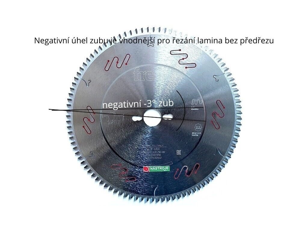 SK pilový kotouč na lamino značky FREUD o rozměrech 300x30-96TFZN je ODHLUČNĚNÝ a má zuby trapézové s negativním úhlem -3°. Lze použít pro řezání lamina bez předřezu. V kombinaci s předřezovým kotoučem dává velkou kvalitu řezu.