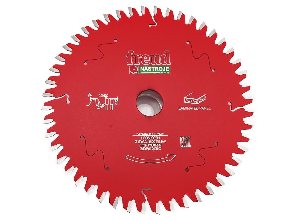 Profesionální pilový kotouč FREUD 160×20–48TFZ je určený pro přesné, čisté a vysoce kvalitní řezy do lamina a dalších dřevotřískových materiálů, a to zejména při použití na elektrických akumulátorových a ručních okružních pilách. Speciální trapézové ozubení TFZ a extra tenké SK (HM) břitové destičky zajišťují jemný, bezotřepový řez, ideální pro oboustranně laminované desky, kde je kladen důraz na perfektní hranu bez vytrhaných dekorů.